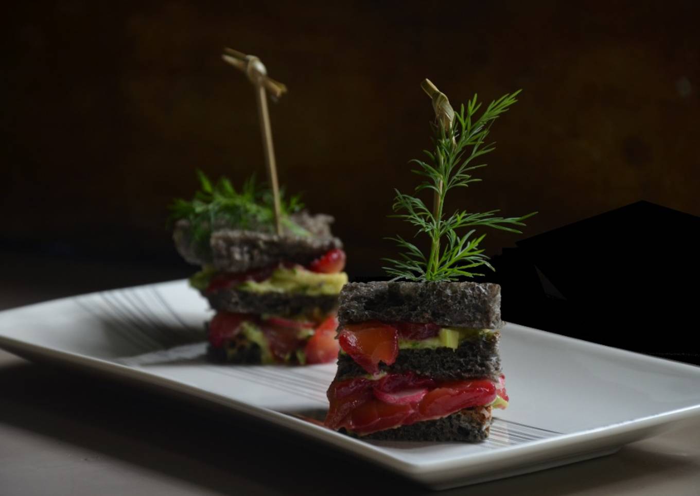 Club sandwich pain à l'encre de seiche, avocat et saumon gravlax à la betterave