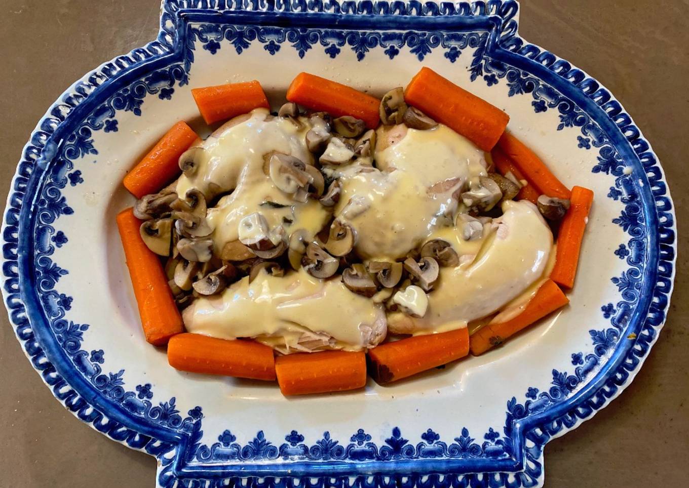 Cette recette est un peu dérivée de la fameuse Poule au Pot du bon roi Henri IV. Elle est un petit peu plus gourmande à cause de sa sauce mais les goûts sont proches. Ma mère avait l’habitude d’en faire durant l’hiver. C'est encore l'automne, mais ici, au Québec la neige est annoncée pour la semaine prochaine alors on s'autorise les plats "comfort-food" d'hiver. Elle avait aussi une option « orientale » de cette recette, en ajoutant une cuiller ou deux de poudre de curry à la sauce, c’est très bon également mais je ne sais pas si Henri IV aurait apprécié.