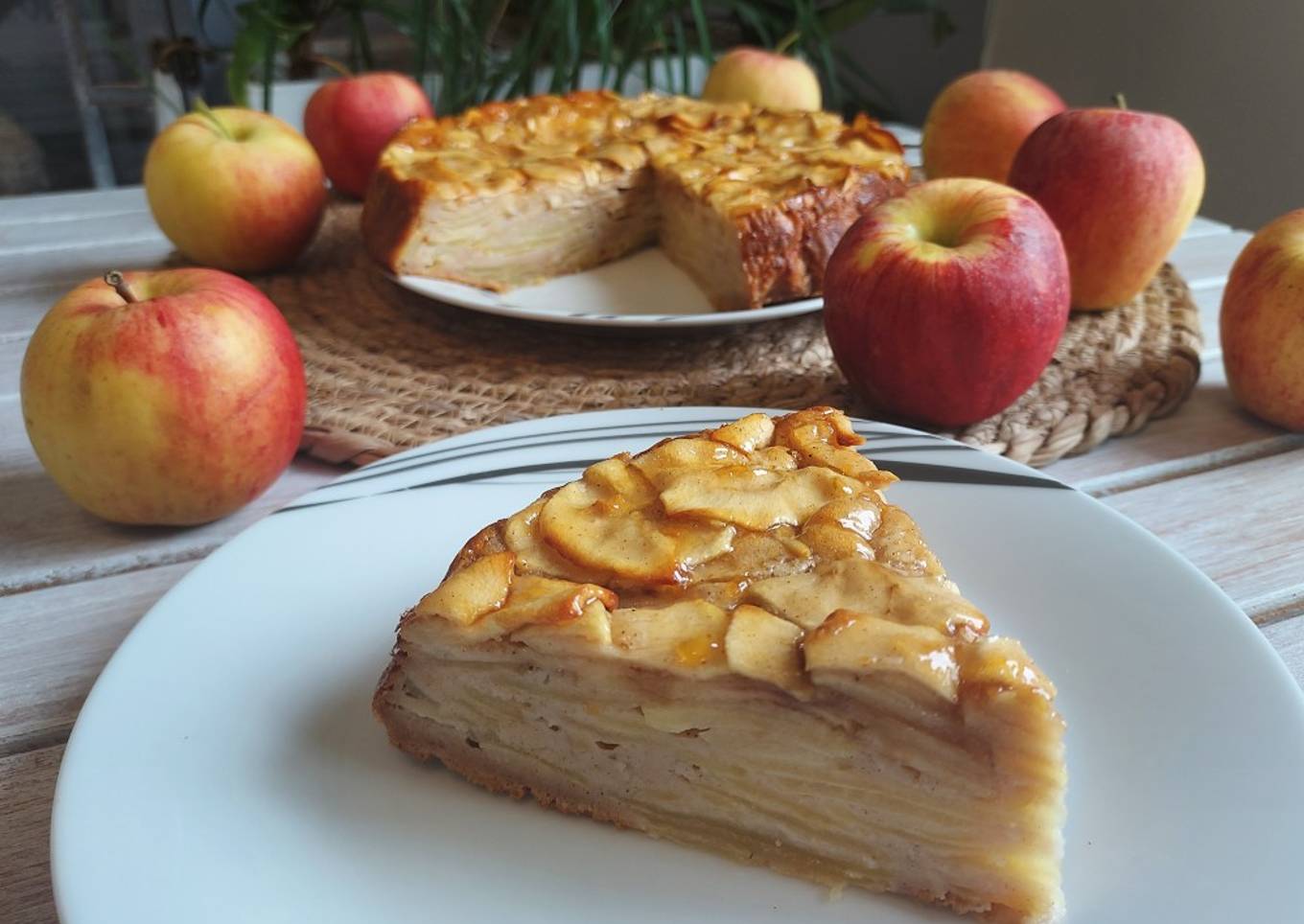 C'est un gâteau très particulié avec une consistance presque crémeuse grâce à la grande quantité de pommes et à la présence de peu de pâte utilisée comme liant, aux nombreuses tranches de pommes très fines s'ajoute une pâte légère, faite avec très peu de matière grasse, c'est un dessert très gourmand et pas du tout écoeurant, en plus healty et peu calorique car j'ai remplacé le sucre par du sirop d'agave, très faible en calories. L'arôme intense de la canelle vous captivera, ainsi que toutes ces couches de pommes.