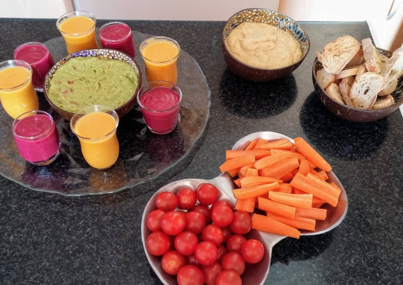 On peut jouer avec les couleurs en faisant des verrines de carottes/cumin, de mousse de betterave, de l'houmous, du guacamole, le tout accompagné de légumes et croûtons.