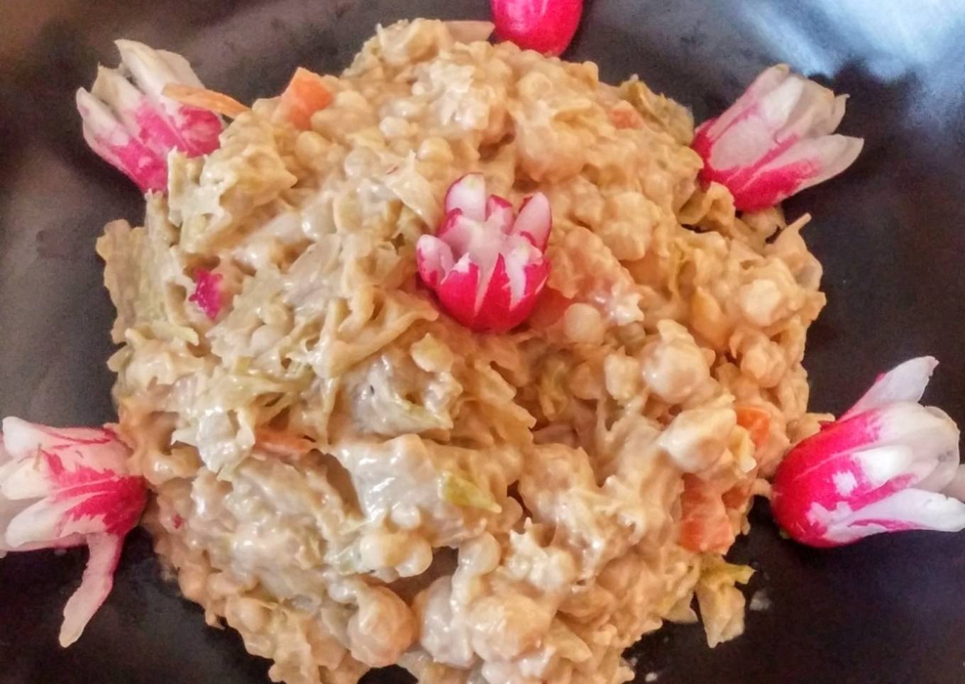 Chou frisé/carottes/perles de couscous/pois chiches/sauce coco-cacahuète-sriracha (vegan)