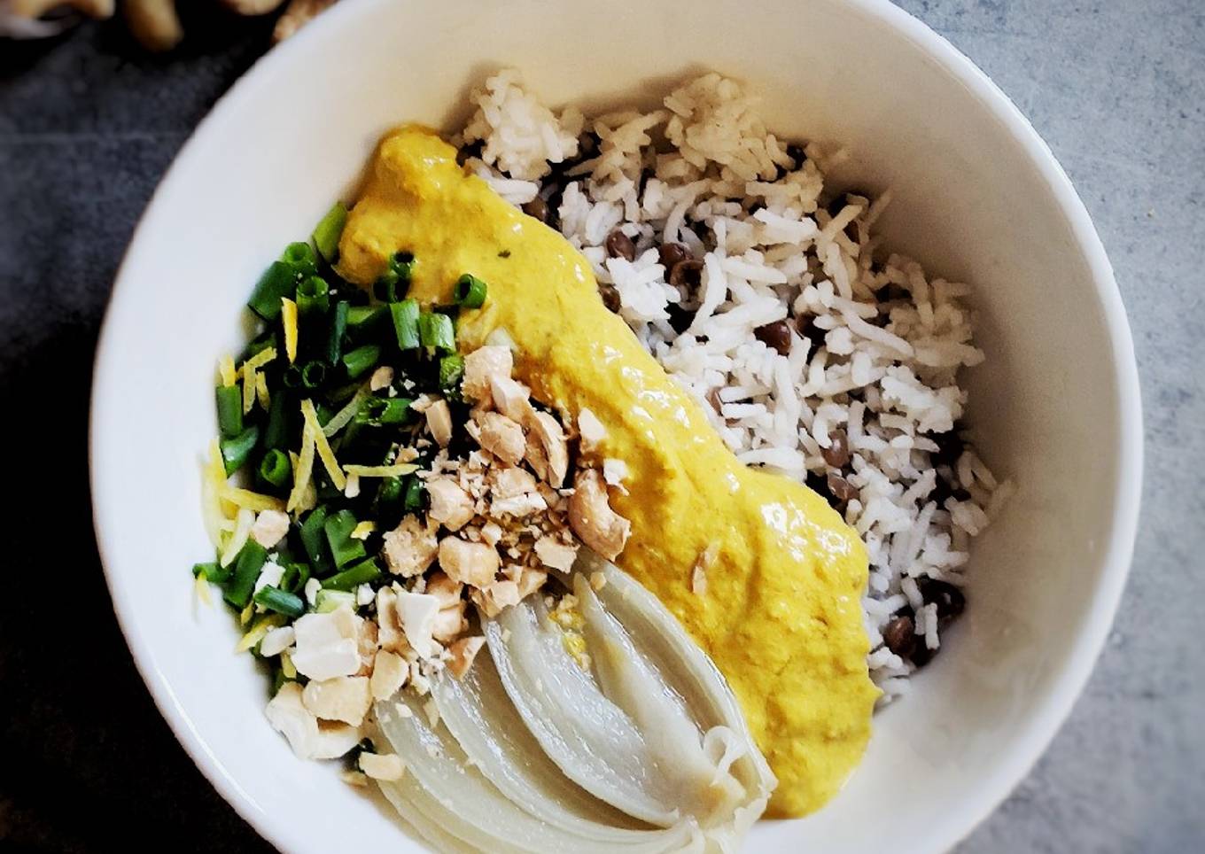 - Dressage : disposer dans une assiette creuse le riz -lentilles. Décorer d'un quart d'oignon vapeur, de cives ciselées et de zestes finement coupés. Pour finir, ajouter quelques noix de cajou grossièrement broyées !